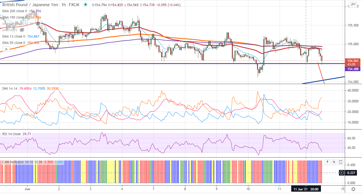 GBPJPY continues to trade weak after a minor pullback till 155.30. The overall trend is bearish as long as resistance 156.10 holds. The slight delay in reopening in the UK due to the delta corona variant is putting pressure on the pair at higher levels. GBPUSD pared some of its early gains and a break below 1.4070 confirms further bearishness. USDJPY is holding above 109.50, any breach above 109.85 confirms further bullishness. It hits an intraday low of 154.56 and is currently trading around 154.671.