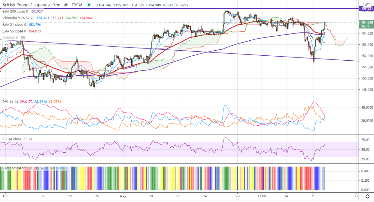 GBPJPY has halted its three weeks of the bearish trend and shown a nice recovery. The jump in pound sterling against all majors is supporting the pair at lower levels. GBPUSD is holding well above 1.3900 levels on Brexit optimism and hopes of reopening of UK economy by Jul 19th, 2021. Markets eye UK SDJPY is holding well above 110 level, any break above 111 confirms significant bullishness. GBPJPY hits an intraday high of 153.77 and is currently trading around 153.562.