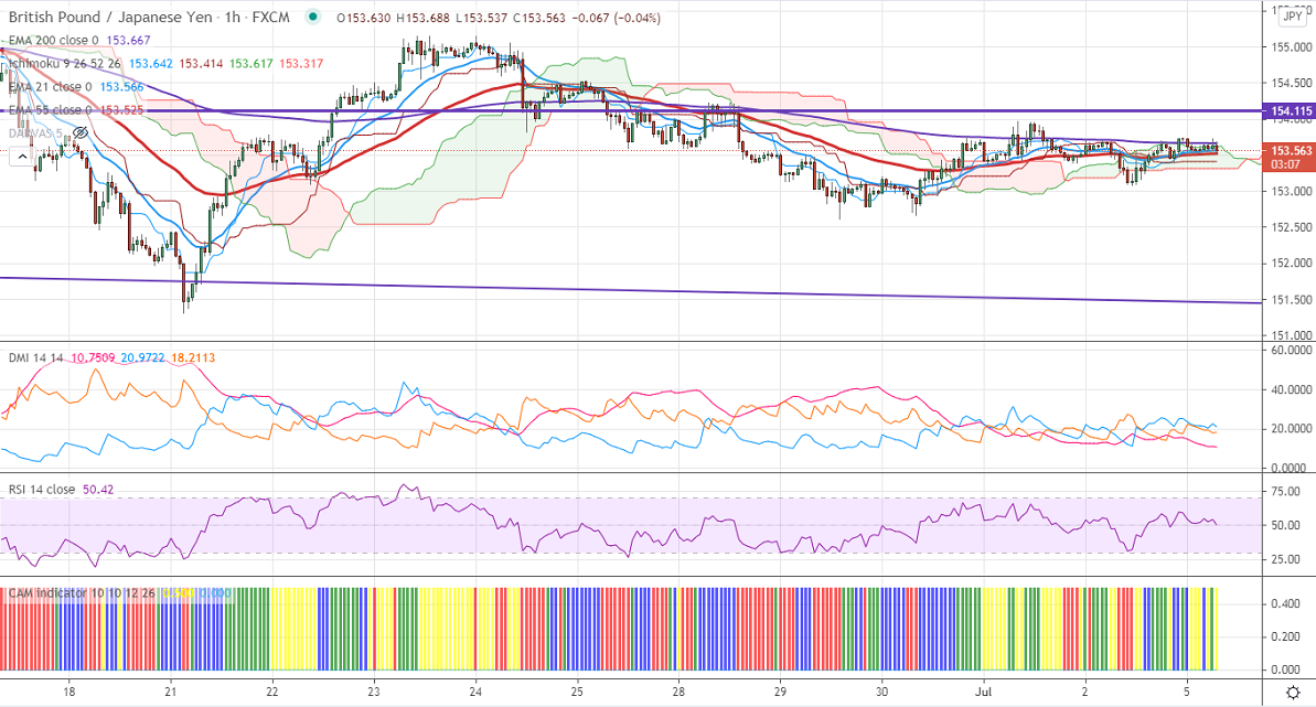The pair's near-term resistance around 154.22, any break above targets 154.60/155.15. Significant trend reversal only if it breaks 156.60. On the lower side, near-term support is around 153.40. Any indicative violation below that level will drag the pair down to 152.80/152.50/151.30. Significant trend reversal only if it breaks below 147.40.