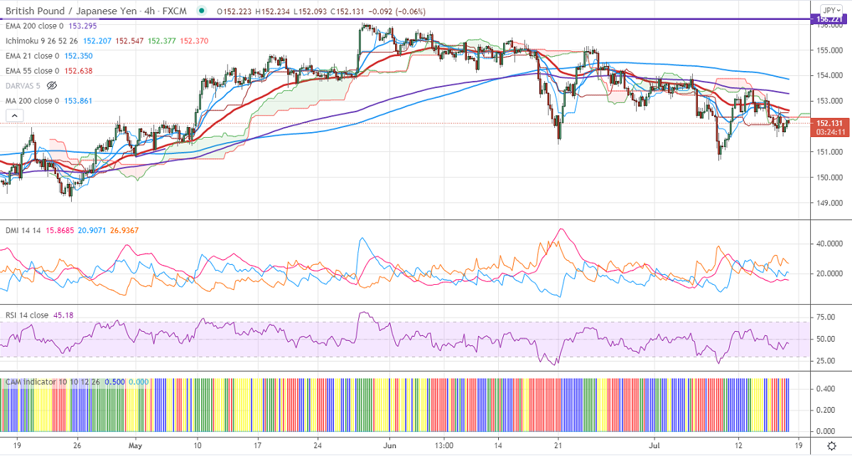GBPJPY has shown a minor pullback after a minor decline to 151.60. The minor jump in Yen has dragged the pair down from a temporary top of 153.48. The US 10-year bond yield hits fresh weekly lows at 1.299% is preventing further upside in USDJPY. The number of people who have filed for unemployment benefits in the UK declined to-114.8K in June from-92.6K the previous month. The unemployment rate dropped to 6.2% from 5.8%. GBPJPY hits an intraday low of 152.09 and is currently trading around 152.114.