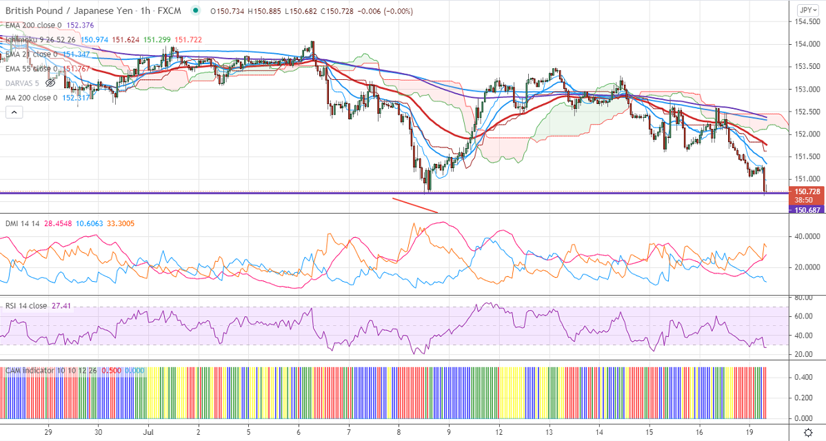 GBPJPY continues to trade lower for a second consecutive week and lost more than 150 pips on-board-based Pound sterling. GBPUSD hits 3- month low on US dollar strength. The surge in new delta variant coronavirus has increased demand for safe-haven assets like the dollar, yen. The UK has reported 54674 new coronavirus cases on Sat, the highest since Jan. GBPJPY hits an intraday low of 152.09 and is currently trading around 152.114.