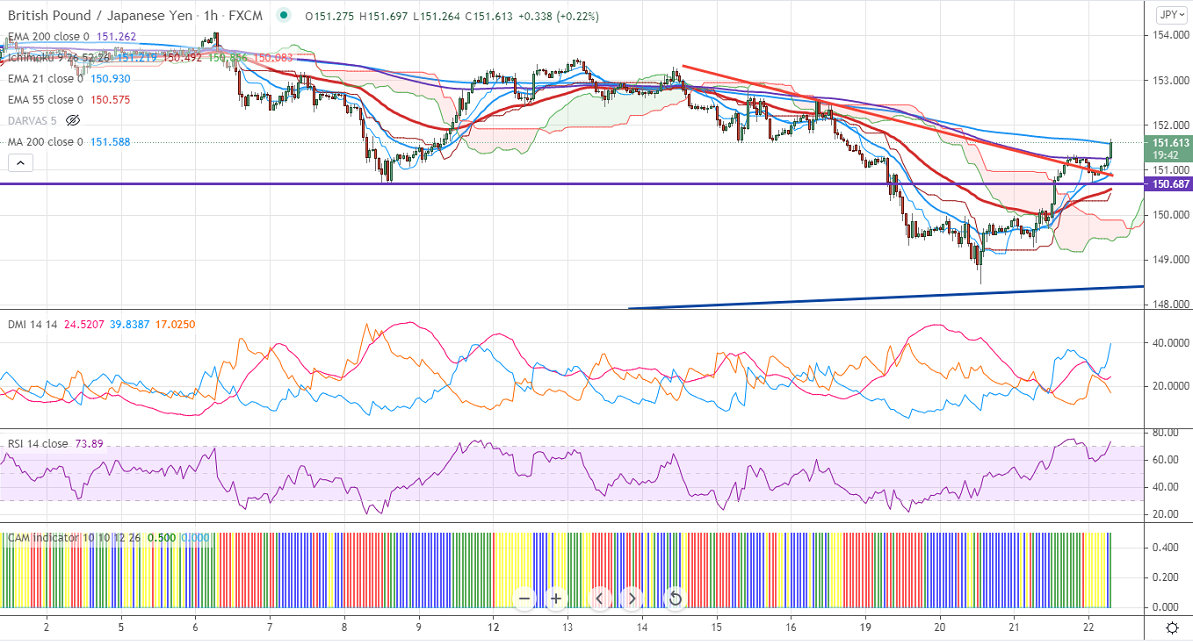 GBPJPY has halted its six days of the bearish trend and shown a minor pullback. The pound sterling surged sharply against the USD despite a jump in coronavirus cases and Brexit uneasiness. The UK has reported a high number of daily coronavirus 44104 vs 42,302 last Wednesday. The European Union rejected UK demand for post-Brexit renegotiations with Northern Ireland. GBPJPY hits an intraday low of 149.96 and is currently trading around 149.57.