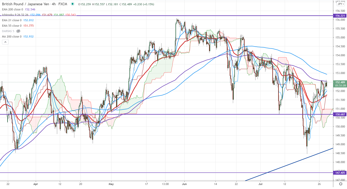The pair's immediate resistance is around 152.65, any breach above targets 153/153.30/154. Significant bullish continuation if it breaks 156.60. On the lower side, near-term support is around 151.40. Any indicative violation below targets 150.60/150/149. Significant trend reversal only if it breaks below 147.40.