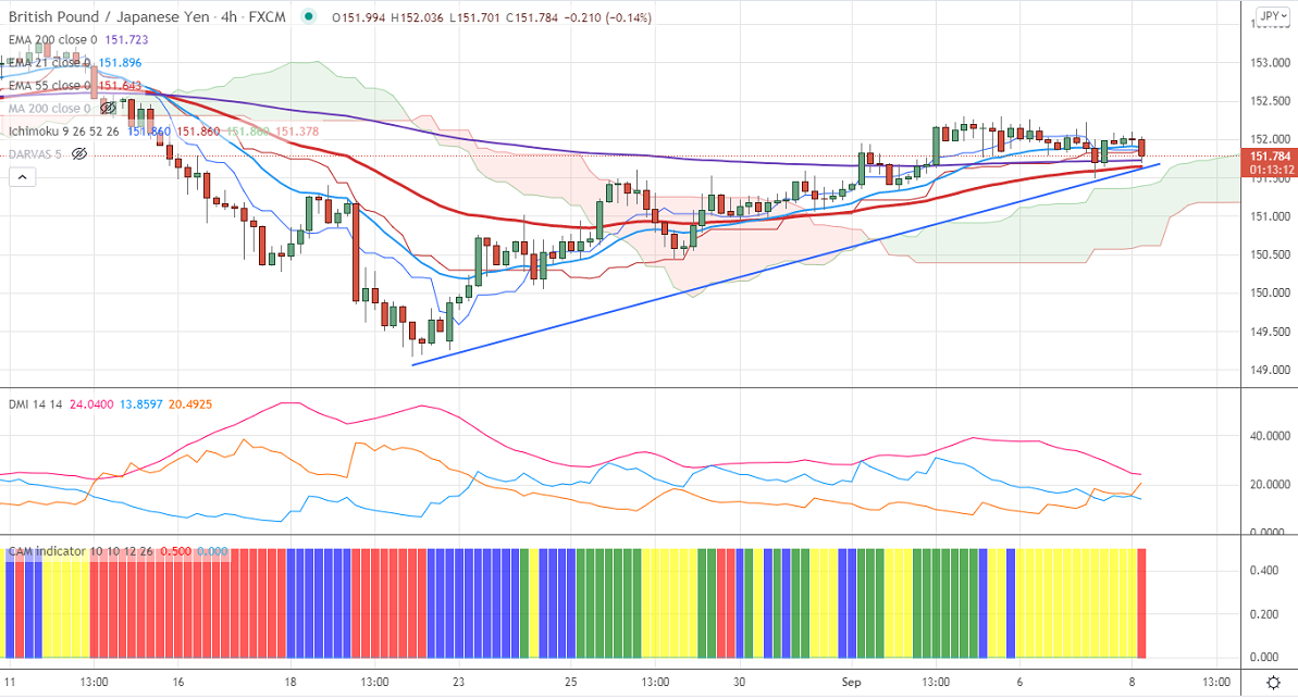 GBPJPY is trading in a narrow range between 152.29 and 151.49 for the past four days. The minor weakness in pound sterling as UK PM Johnson plans to increase tax to pay for health and social care reform. GBPUS D is holding below 1.3800 levels, a dip till 1.37150 is possible. The intraday trend of GBPJPY is bullish as long as support 151 holds.