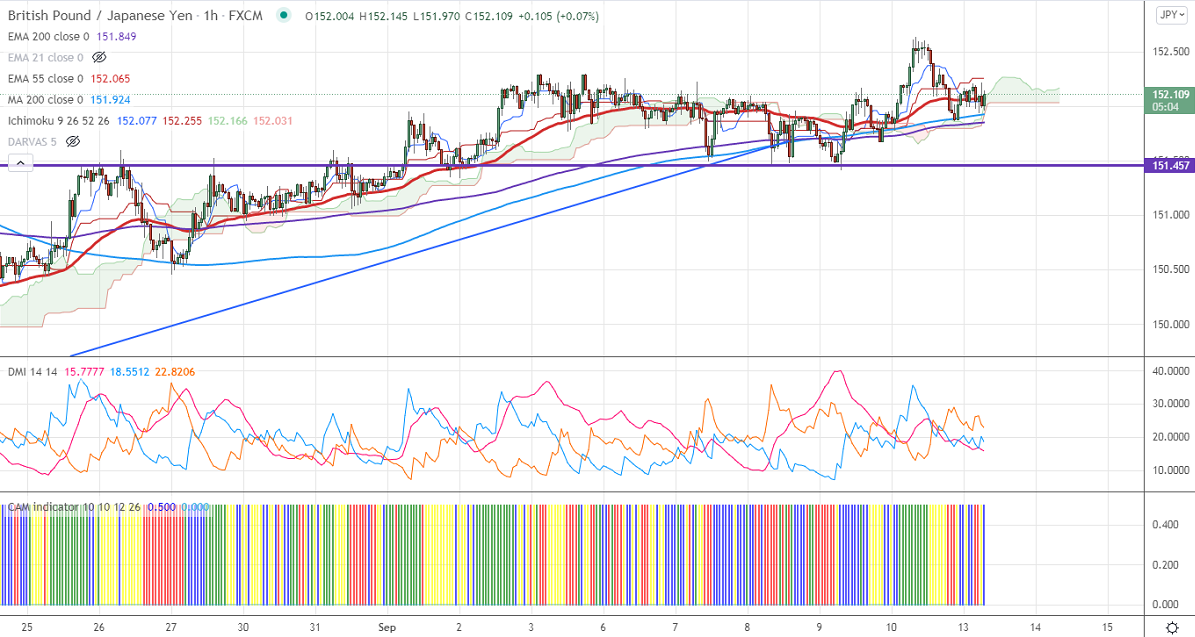 GBPJPY is trading in a narrow range between 152.63 and 151.42 for the past week. The slight weakness in the pound sterling against the USD is preventing the pair from further upside. GBPUSD is trading below 200- HMA on surge in coronavirus cases. The EU Brexit chief has rejected UK demand to rewrite Northern Ireland trade. The intraday trend of GBPJPY is bullish as long as support 151 holds.