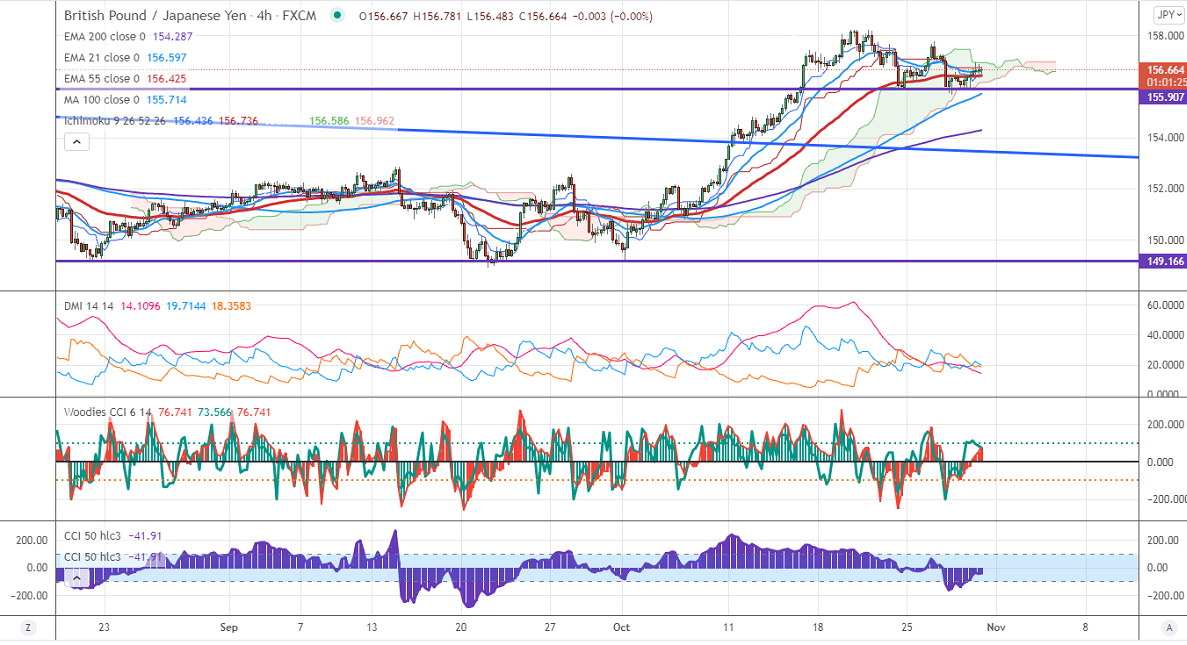 GBPJPY recovered from a low of 155.98 made yesterday on the strong Pound sterling. It hits a high of 156.95 and is currently trading around 156.682.