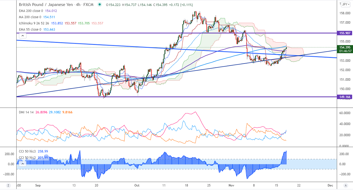 GBPJPY surged more than 200 pips on the strong pound sterling. GBP surged past the 1.3450 level on upbeat inflation data. UK annual rate of Consumer price index rose by 4.2% in Oct compared to a forecast of 3.9%. The intraday trend is bullish as long as support 153.80 holds. It hits a high of 154.73 at the time of writing and is currently trading around 153.57.