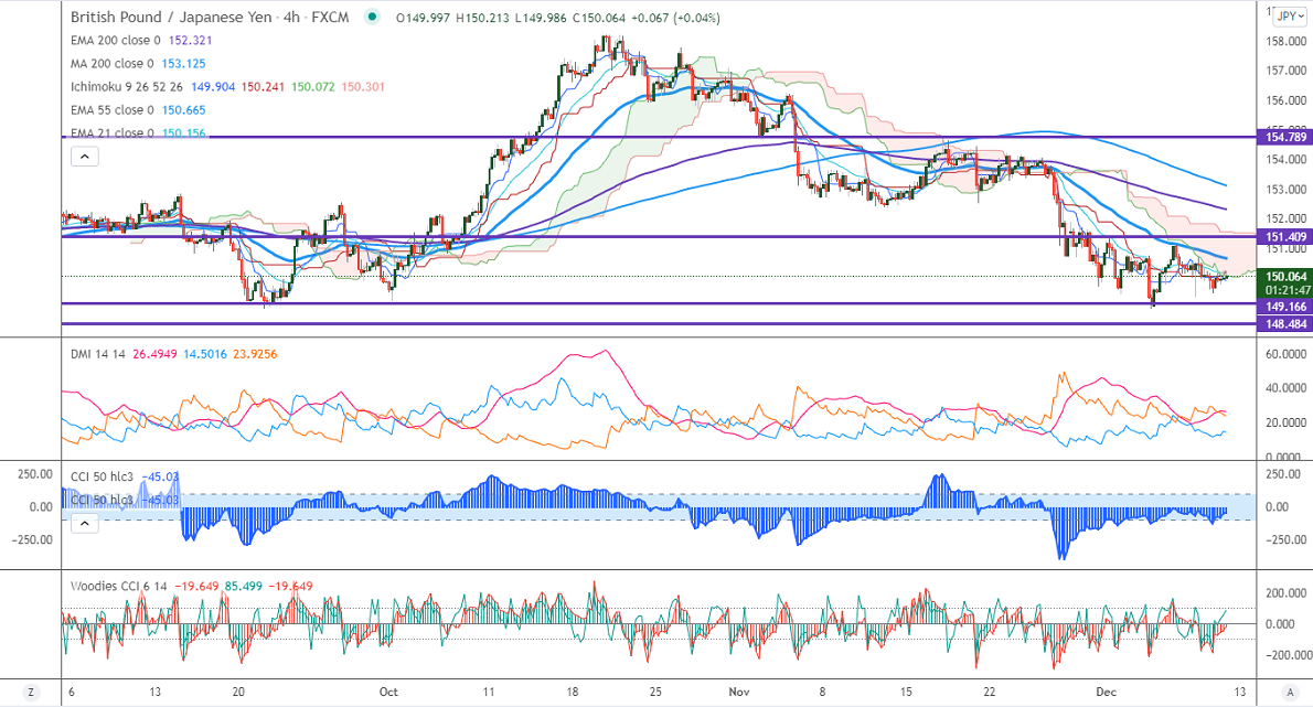 GBPJPY is trading flat with a bearish bias for the past three days. The Pound sterling showed a minor decline after weak UK economic data. UK GDP came at 0.1% m/m in Oct vs forecast of 0.40%. The Industrial and manufacturing production data of Britain misses estimates. The Brexit uncertainty and fear of corona's new variant are putting pressure on GBP. Any breach below 1.3180 confirms intraday bearishness. The intraday trend of GBPJPY is bearish as long as resistance 151.15 holds. It hits a low of 149.48 yesterday and is currently trading around 150.11.