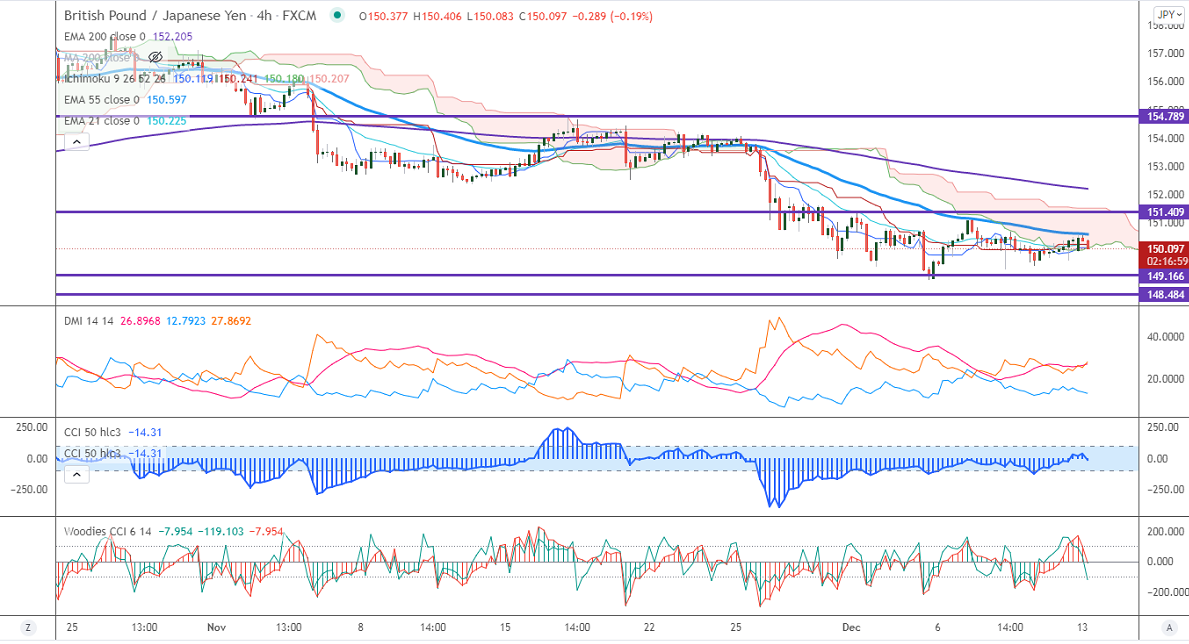 GBPJPY has once again declined after touching 200-H MA. The intraday trend is neutral as long as resistance 150.60 holds. The pound sterling is trading below 1.3250 against USD on fear of the Omicron virus in the UK. The slight pullback in the US dollar and US treasury yields also dragging GBPUSD. Any breach below 1.3180 confirms intraday bearishness. GBPJPY hits a low of 150.15 at the time of writing and is currently trading around 150.168.