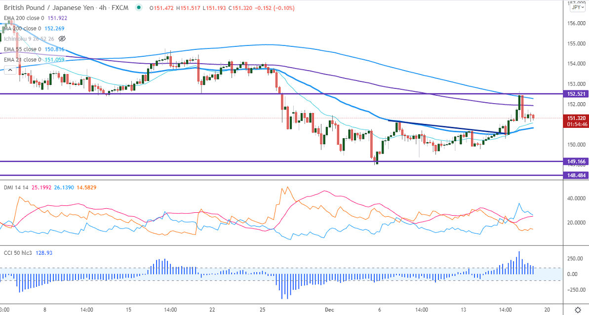 GBPJPY surged sharply after the Hawkish Bank of England. The central bank has surprised markets by raising rates from a record low of 0.10% to 0.25% due to a jump in inflation. The pound sterling hits a two-week high against the US dollar at 1.33741. Any breach above 1.3380 confirms intraday bullishness. The intraday trend is bearish as long as resistance 152.50 holds. GBPJPY hits an intraday low of 151.19 and is currently trading around 151.232.