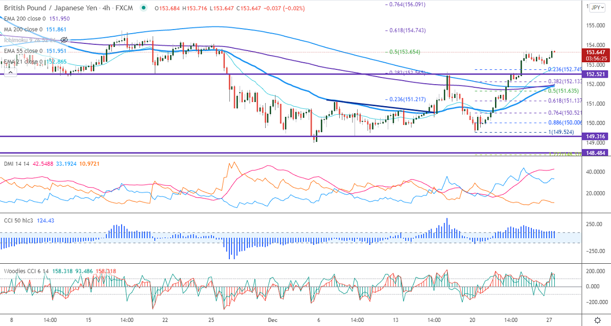 GBPJPY continues to trade higher for a third consecutive week on the strong Pound sterling. GBP recovered sharply against USD on easing Corona concerns and board-based US dollar selling. The number of new omicron cases surged to 122186 in the United Kingdom. But hospitalization and deaths are very less compared to Delta variant. Any breach above 1.3380 confirms intraday bullishness. The intraday trend of GBPJPY is bullish as long as support 152.80 holds. GBPJPY hits an intraday high of 153.76 and is currently trading around 153.62.