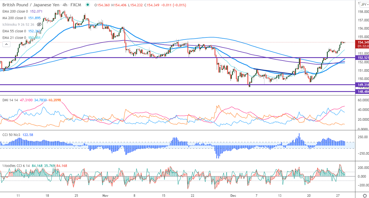 GBPJPY surged more than 100 pips yesterday on the strong pound sterling. GBP hits a five-week high on board-based US dollar weakness. The decrease in the number of hospitalization cases due to omicron in the UK is supporting Pound sterling at lower levels. The cable is holding above 200-W EMA, a jump till 1.3520 is possible. The intraday trend of GBPJPY is bullish as long as support 153.30 holds. GBPJPY hits an intraday low of 154.23 and is currently trading around 154.29.
