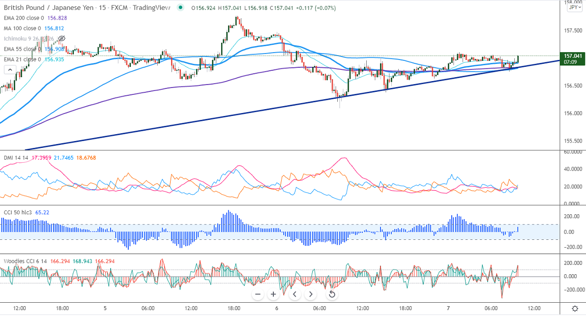 GBPJPY has shown a minor pullback after hitting a low of 156.08. The minor weakness in the pound sterling is putting pressure on the pair at higher levels. GBP recovered more than 30 pips against USD on upbeat market sentiment. Market eyes US NFP and Brexit for further direction. The UK has reported another 179756 daily cases slightly lower compared to the previous day-case 194975. Any breach above 1.3600 confirms further bullishness. The intraday trend of GBPJPY is bullish as long as support 154.80 holds. GBPJPY hits an intraday low of 156.75 and is currently trading around 156.80.