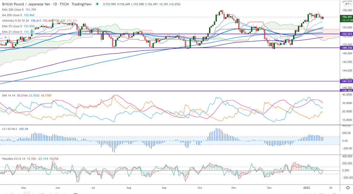GBPJPY has taken support near 21-day EMA and shown a minor pullback. The pound sterling has been fluctuating in a narrow range between 1.37428 and 1.36530 for the past two days. Markets eye UK political developments for further direction. The latest YouGov/Times opinion poll shows that the Labor party has an 11-point vote lead with 40% of the vote to the conservatives. Any breach above 1.3750 confirms further bullishness. The intraday trend of GBPJPY is bearish as long as resistance 157.75 holds. GBPJPY hits a high of 156.64 at the time of writing and is currently trading around 156.474.