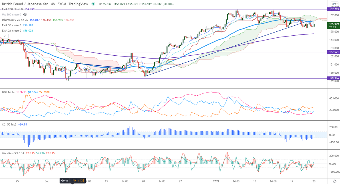 GBPJPY has formed a double bottom around 155.40 and shown a minor pullback. The Pound sterling regained after upbeat UK inflation data. The yearly CPI data climbed to 5.4% in December compared to an estimate of 5.1%. Any breach below 1.3570 confirms further bearishness. The intraday trend of GBPJPY is bearish as long as resistance 156.10 holds. GBPJPY hits an intraday low of 155.40 and is currently trading around 155.4.