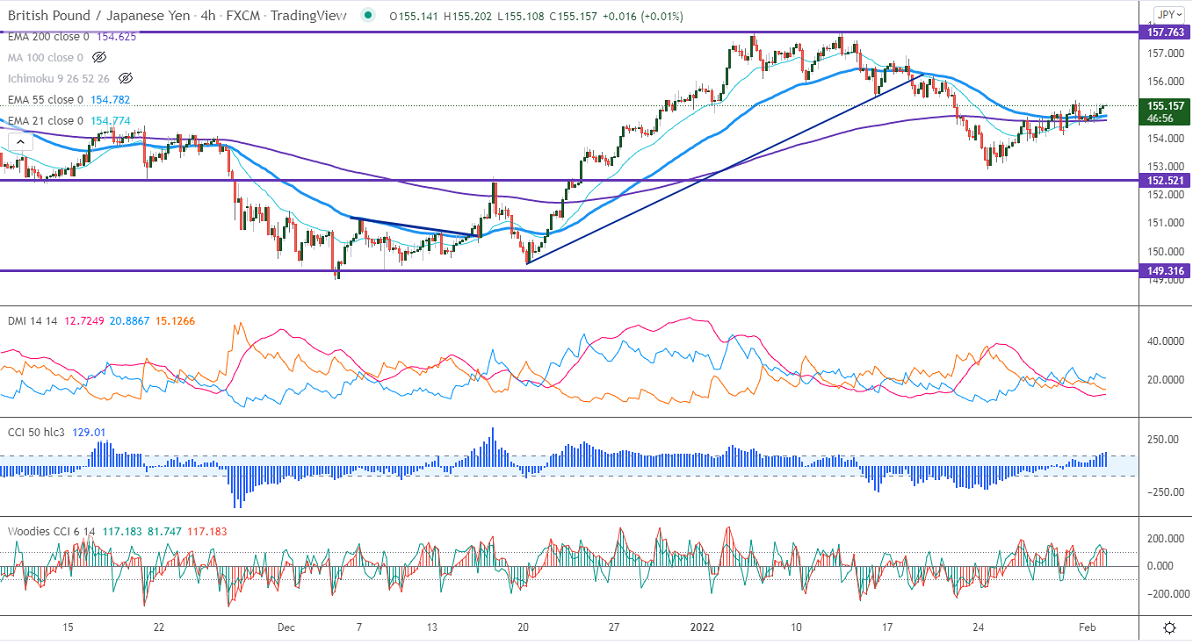 GBPJPY is trading higher for a second consecutive week and holding above 155 level on the strong pound sterling. The pound sterling regained above 1.35000 after upbeat UK PMI data. It has surged to 57.30 in Jan, the fastest rate in six months. Any breach above 1.35550 will take the pair to the next level 1.3600. The intraday trend of GBPJPY is bullish as long as support 154 holds. GBPJPY hits an intraday high of 155.20 and is currently trading around 155.145.