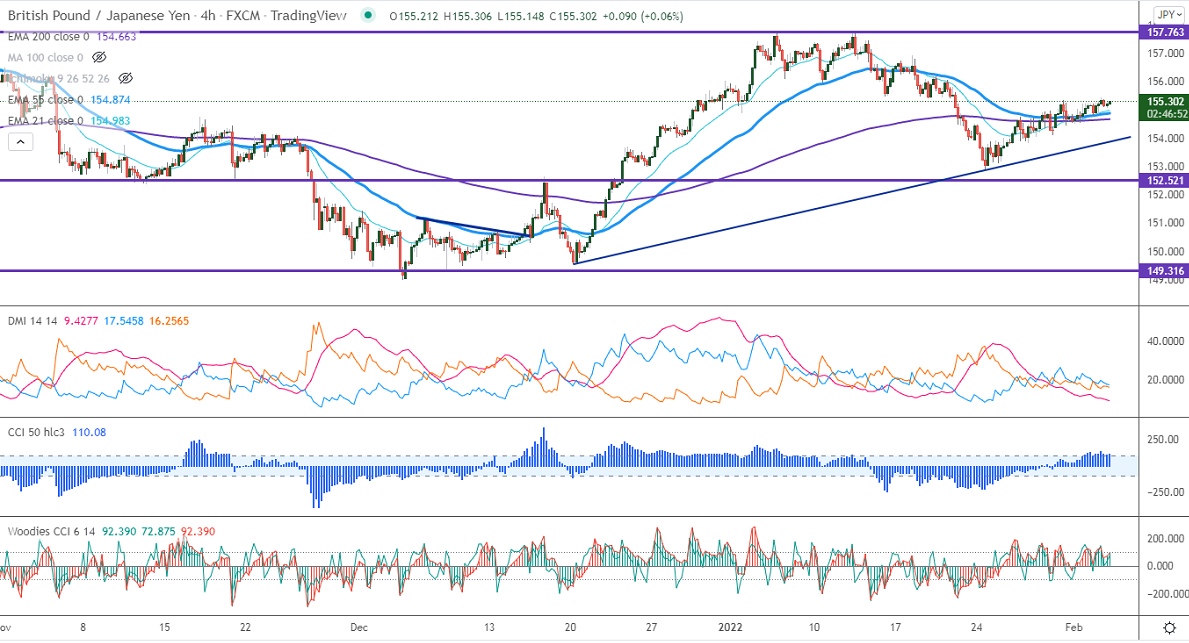 GBPJPY is trading flat ahead of Bank of England monetary policy. The central bank expected to lift rates by 25bpbs to combat higher inflation. The pound sterling is holding above 1.35000. Any breach above 1.3600 will take the pair to the next level 1.3700. The intraday trend of GBPJPY is bullish as long as support 154 holds. GBPJPY hits an intraday high of 155.29 and is currently trading around 155.23.