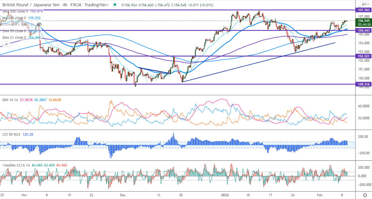 The immediate resistance is around 156.70, any break above targets 157/157.75/158.50. Significant bullish continuation if it breaks 158.50. On the lower side, near-term support is at 155.50. Any indicative violation below targets 155/154/153/151.95/150.