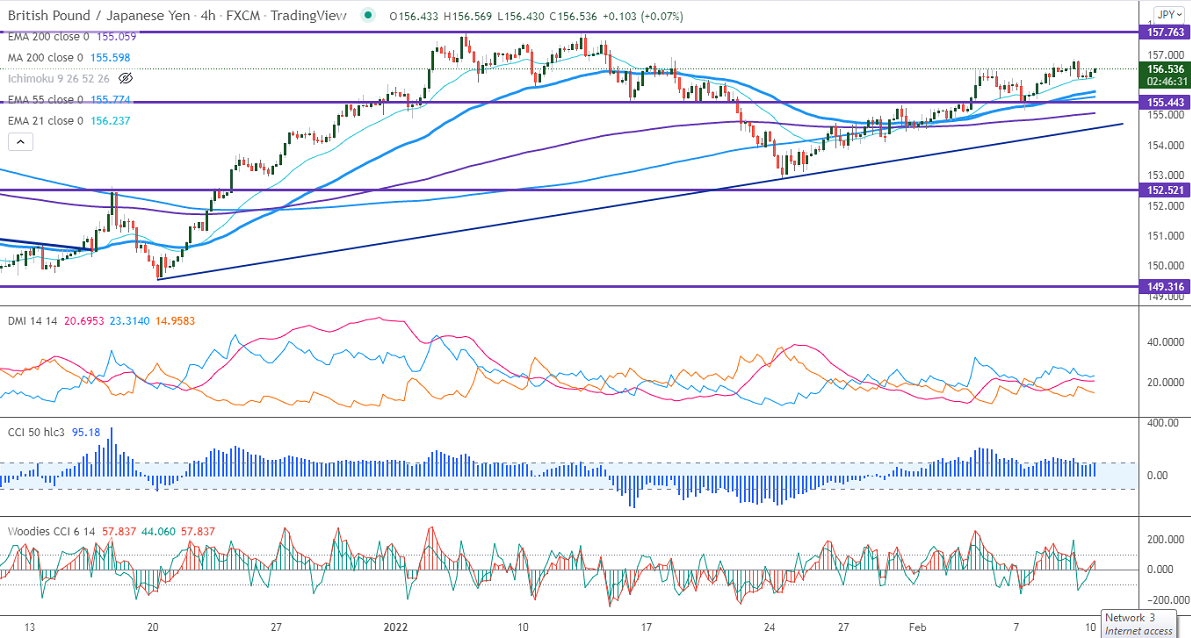 The immediate resistance is around 156.70, any break above targets 157/157.75/158.50. Significant bullish continuation if it breaks 158.50. On the lower side, near-term support is at 155.50. Any indicative violation below targets 155/154/153/151.95/150.