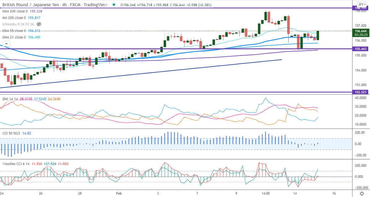 GBPJPY took support near 200-4H EMA and showed a minor pullback from a 1-week low. The pound sterling regained above 1.35000 after UK jobs data. In January jobless claims change came at -31.9k vs. a forecast of -43.3k. Any breach below 1.3490 confirms further bearishness. The intraday trend of GBPJPY is bearish as long as resistance 158.50 holds. GBPJPY hits an intraday high of 156.71 and is currently trading around 156.548.