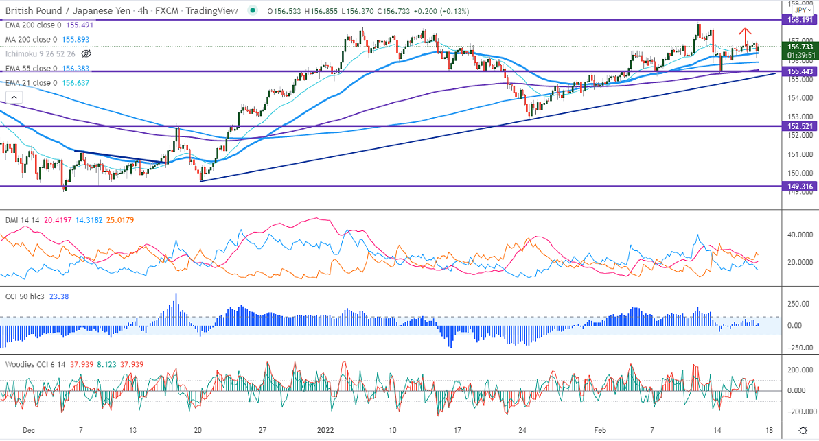 GBPJPY showed a sell-off after hitting a high of 156.99 at the time of writing. The decline was mainly due to Russia and Ukraine tension having increased demand for safe-haven demand assets like yen. The Pound sterling gained above 1.3600 despite weak market sentiment. Any breach above 1.3610 confirms further bullishness. The intraday trend of GBPJPY is bullish as long as support 155.40 holds. GBPJPY hits an intraday high of 156.85 and is currently trading around 156.773.