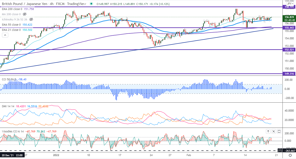 GBPJPY is consolidating in a narrow range between 157.11 and 156.05 for the past two days. The pair regained more than 50 pips in hopes of a diplomatic agreement between Russia and Ukraine. Markets eye Blinken and Lavrov meeting next week for further direction. The Pound sterling is holding above 1.3600 on upbeat UK retail sales. It came at 1.9% MoM in January vs. a forecast of 1.0%. Any breach above 1.3640 confirms further bullishness. The intraday trend of GBPJPY is bullish as long as support 156 holds. GBPJPY hits an intraday high of 156.85 and is currently trading around 156.807.