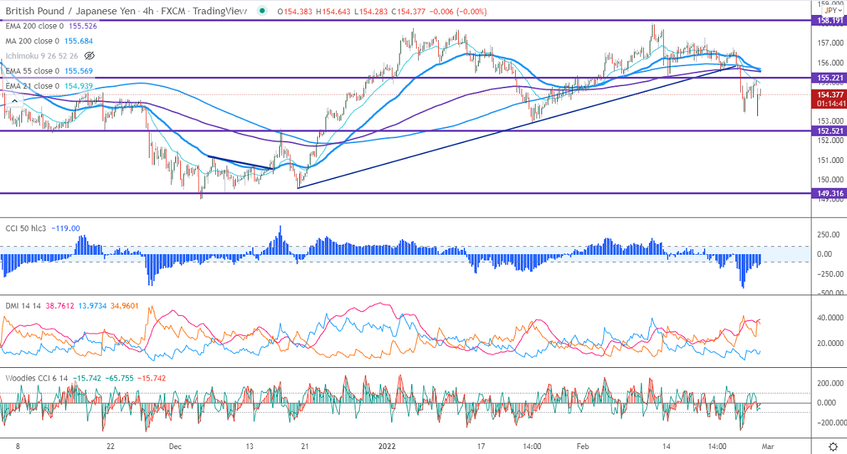 GBPJPY is under pressure after a minor pullback above 155. The pound sterling showed a gap up after a massive sell-off on the Ukraine crisis. Any breach above 1.3380 (61.8% fib) confirms further bullishness. Russian Putin has ordered the defense minister and chief of the military to place nuclear forces on high alert. The intraday trend of GBPJPY is bearish as long as resistance 155.30 holds. GBPJPY hits an intraday low of 154.07 and is currently trading around 154.60.