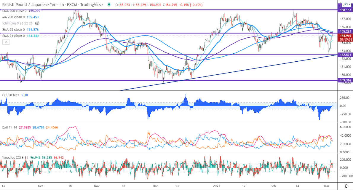 GBPJPY regained above 155 on the strong pound sterling. GBPUSD surged more than 100 pips from a minor bottom 1.32714 despite the cautious market mood. Markets eye Russia and Ukraine peace talks for further direction. The intraday trend of GBPJPY is bullish as long as support 154 holds. GBPJPY hits an intraday high of 155.22 and is currently trading around 155.07.