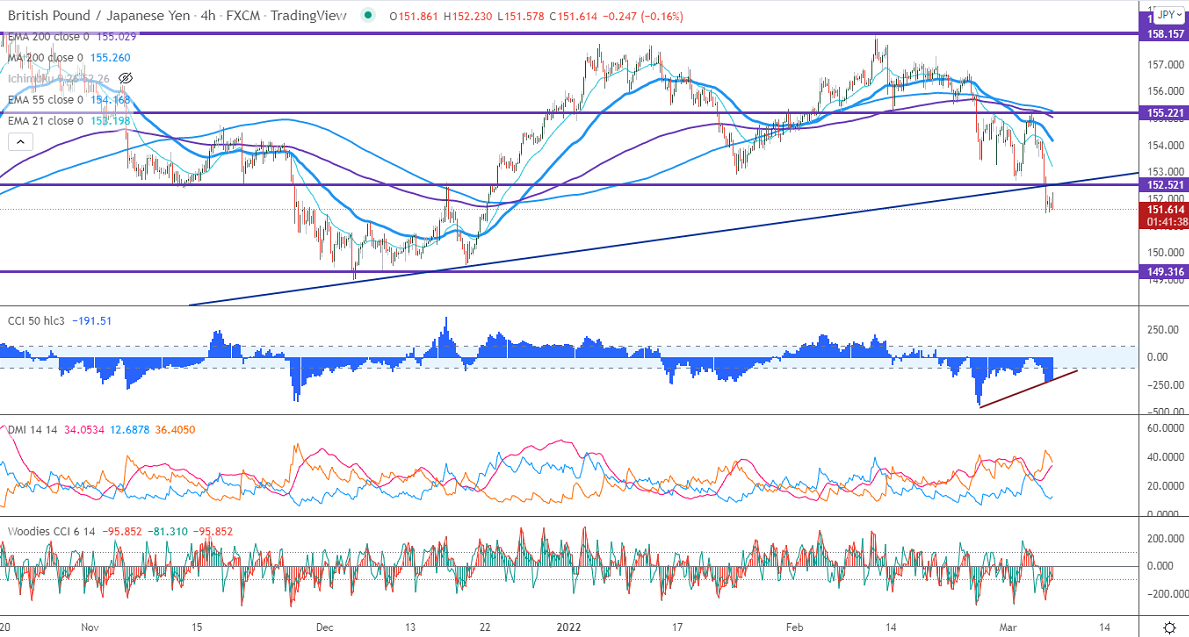 GBPJPY is trading weak for the third consecutive week on the weak Pound sterling. It has lost more than 400 pips against the US dollar as Russia and Ukraine war increased demand for safe-haven assets. Crude gained sharply on fear of US banning Russia oil imports. The intraday trend of GBPJPY is bearish as long as resistance 152.75 holds. GBPJPY hits an intraday low of 151.46 and is currently trading around 151.95.