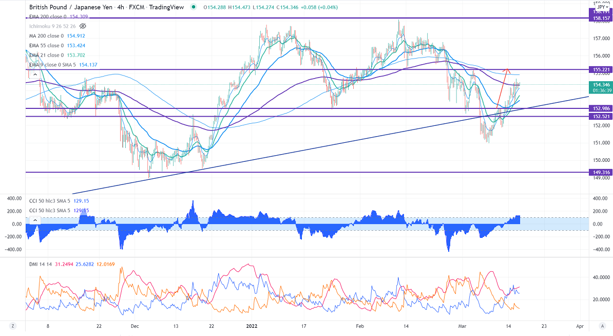 GBPJPY continues to trade higher for fourth consecutive days on weak Yen. The pound sterling recovered above 1.3050 on better than UK employment data. The unemployment rate declined to 3.9% in Jan vs 4%. Any breach above 1.3090 confirms further bullishness. The intraday trend of GBPJPY is bullish as long as support 153.50 holds. GBPJPY hits an intraday high of 154.472 and is currently trading around 154.457.