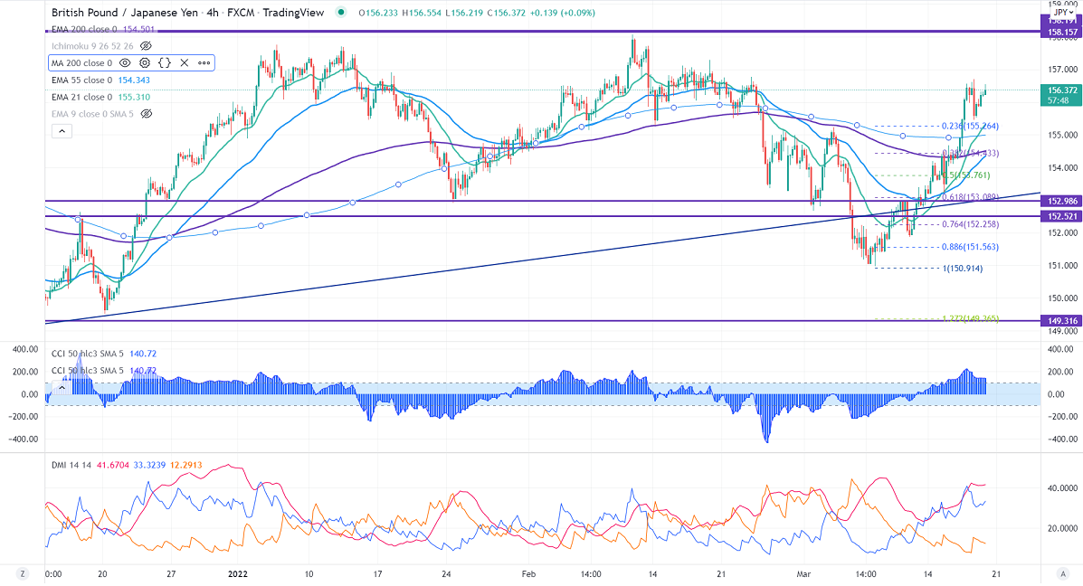 The immediate resistance is around 156.80, any break above targets 157.75/158.20. Significant bullish continuation if it breaks 158.20. A jump to 160 is possible. On the lower side, near-term support is at 155. Any indicative violation below targets 154.20/153.50.