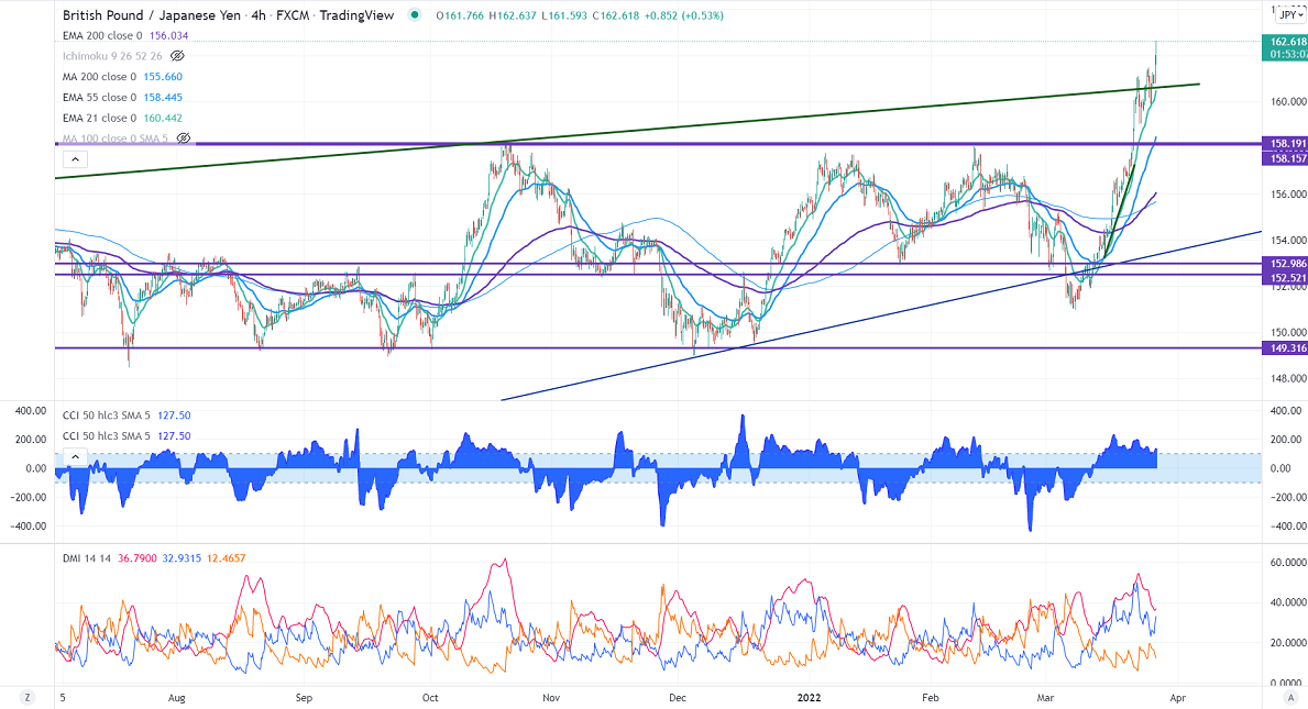 GBPJPY continues to trade higher for a third consecutive week and surged nearly 1000 pips on weak yen. The weakness in the pound sterling against the US dollar is putting pressure on the pair at higher levels. It trades below 1.3150 and markets eye BOE Bailey's speech for further direction. The intraday trend of GBPJPY is bullish as long as support 159.85 holds. GBPJPY hits an intraday high of 162 and is currently trading around 161.80.