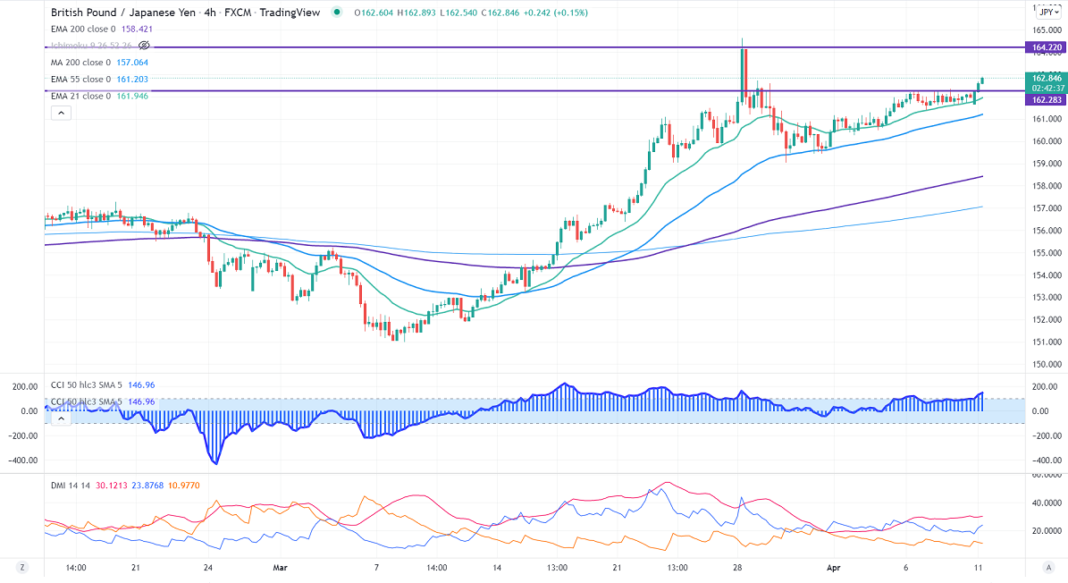 GBPJPY gained sharply on the weak yen. The major sell-off in Pound sterling is preventing the pair from further upside. The board-based US dollar buying on hawkish Fed meeting minutes is dragging GBPUSD further down. Any close below 1.3000 confirms further bearishness. GBPJPY hits an intraday high of 162.81 and is currently trading around 162.68.