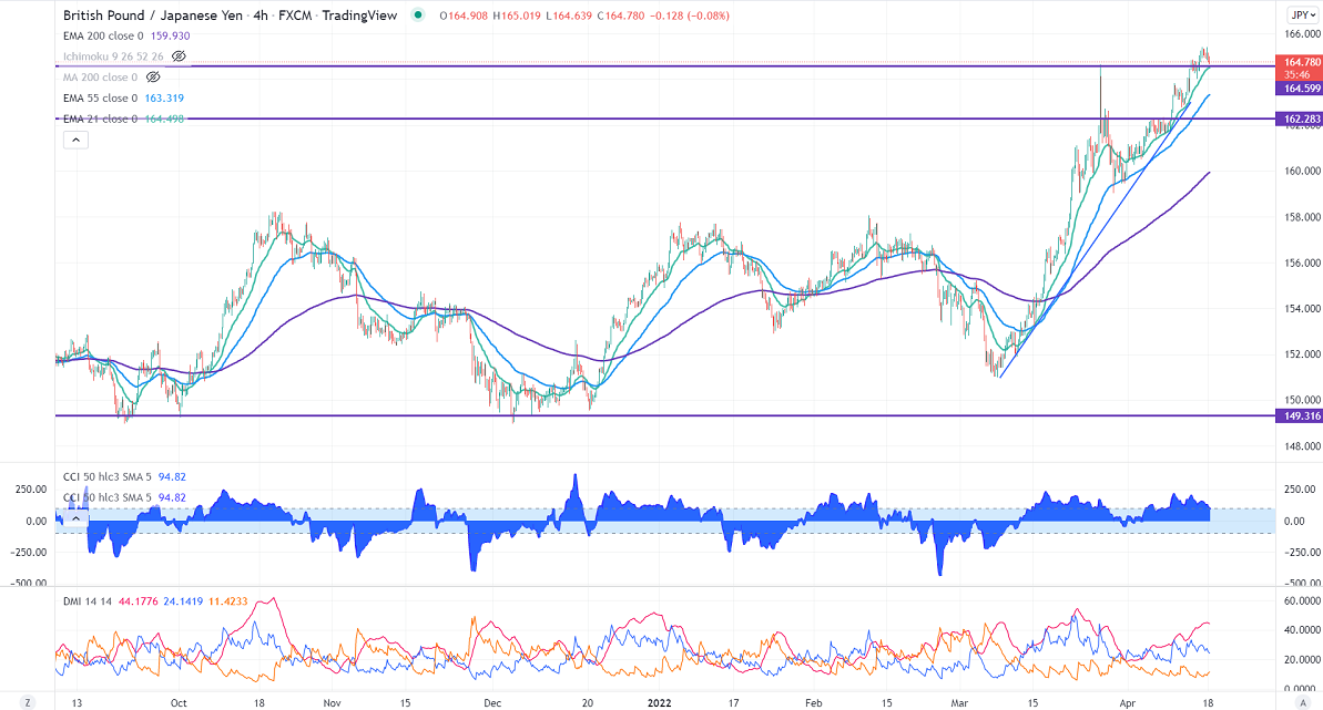 GBPJPY trades higher for a third consecutive week on a weak yen. The weakness in the pound sterling prevents the pair from further upside. GBP lost nearly 150 pips from a minor top of 1.31468 against the US dollar on board-based US dollar buying. Any close below 1.3000 confirms further bearishness. GBPJPY hits an intraday high of 165.42 and is currently trading around 164.911.