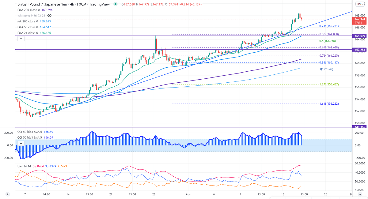 GBPJPY continues to trade higher and hits its highest levels since Mar 2016 on a weak yen. The pound sterling consolidates in a narrow range between 1.2980 and 1.30450 for the past four days. Markets eye BOE Chairman Bailey's speech this week for further direction. Any break above 1.3050 confirms intraday bullishness GBPJPY hits an intraday high of 166.88 and is currently trading around 166.595.