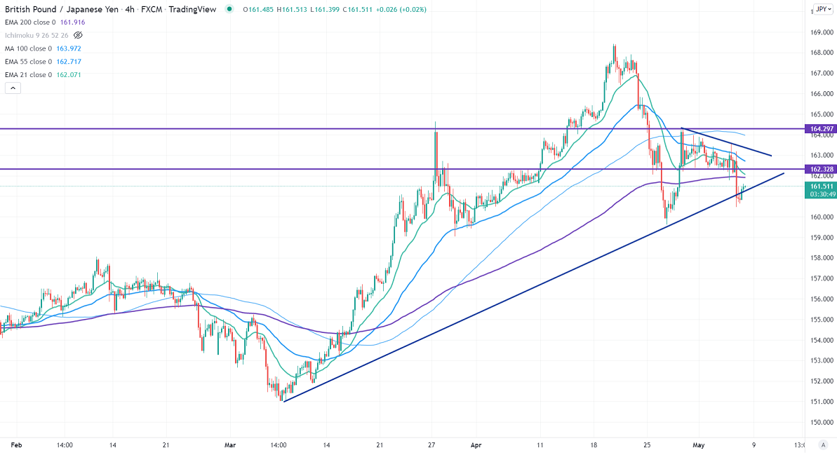 GBPJPY declined sharply on the weak pound sterling. Bank of England raised interest rates by 25 bpbs for the fourth consecutive time to tackle high inflation. The policy divergence between US Fed and BOE puts pressure on the GBPUSD at higher levels. Any breach below 1.2320 confirms further bearishness. GBPJPY hits a low of 160.46 and is currently trading around 161.46.