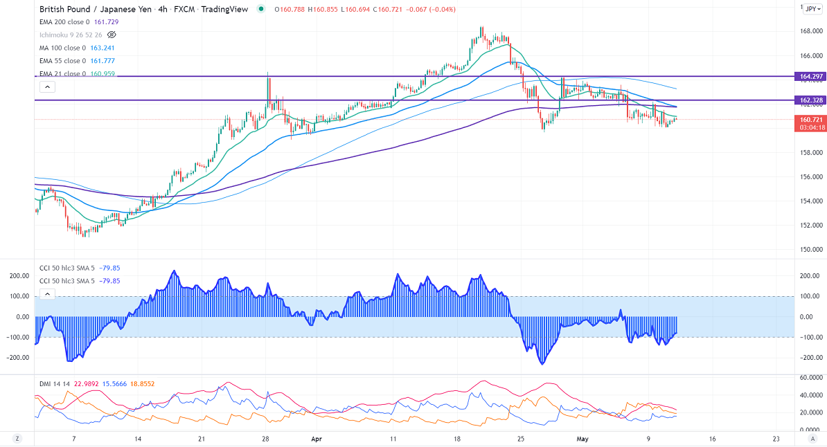 GBPJPY trades range-bound with no follow-through selling. The pound sterling regained from a 2-year low ahead of US CPI and Brexit optimism. The overall trend of GBPUSD is still weak as demand for safe-haven assets improved. Any breach above 1.2360 confirms intraday bullishness. GBPJPY hits an intraday high of 160.87 and is currently trading around 160.80.