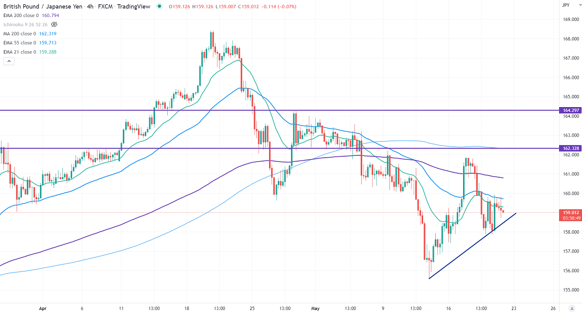 On the lower side, immediate support is around 157.85, breach below will drag the pair to the next level to 157/155. The minor resistance to be watched is around 160, a break above that level confirms intraday bullishness, and a jump to 162/164.25/165 is possible.