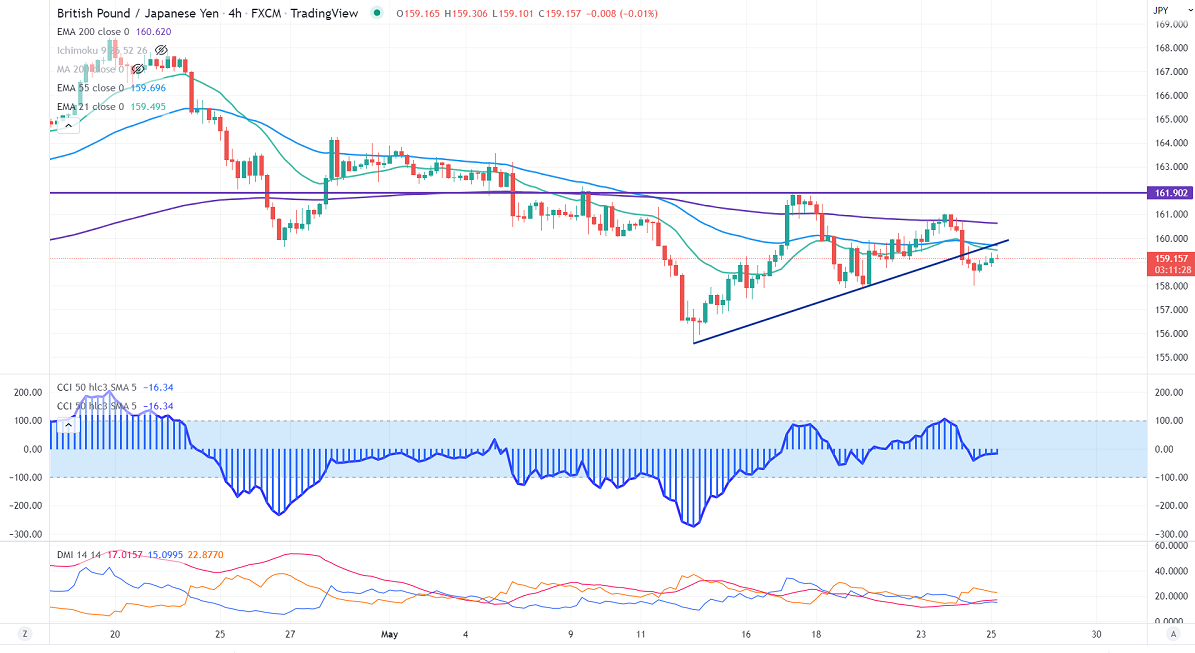 GBPJPY formed a double bottom around 157.90 and showed a minor pullback. The pound sterling regained above 1.2500 after hitting a low of 1.24755 on upbeat market sentiment. Markets eye US Fed meeting minutes for further direction. UK flash manufacturing PMI came at 54.6 in May vs estimate of 54.90. Any breach above 1.2620 (200-4H EMA) confirms further bearishness. GBPJPY hits an intraday low of 159.38 and is currently trading around 159.17.