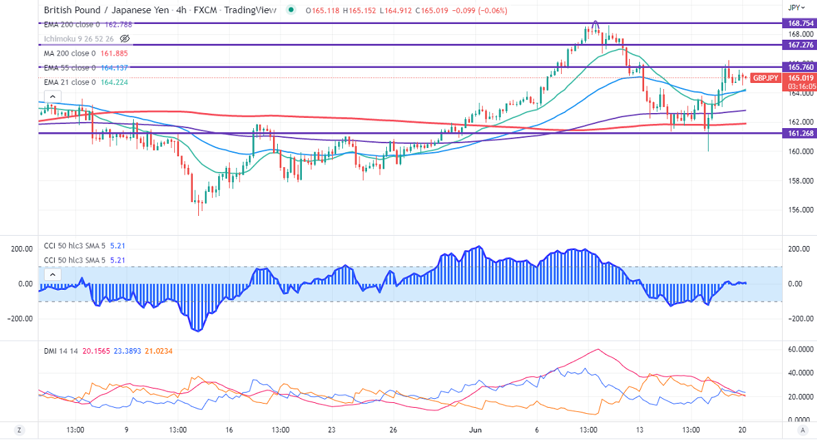GBPJPY recovered sharply after a massive sell-off of more than 500 pips. The pound sterling jumped from two years low of 1.19334 as BOE hiked rates by 25 bpbs for the second consecutive time. Markets eye UK CPI data which is to be released on Wednesday for further direction. A breach above 1.2300 confirms intraday bullishness. Technically in the 4-hour chart, the pair is holding above short term (21- and 55 EMA) and 200 MA (161.87). Any close below 161.80 will drag the pair down to 160/159. GBPJPY hits an intraday low of 164.47 and is currently trading around 165.05.
