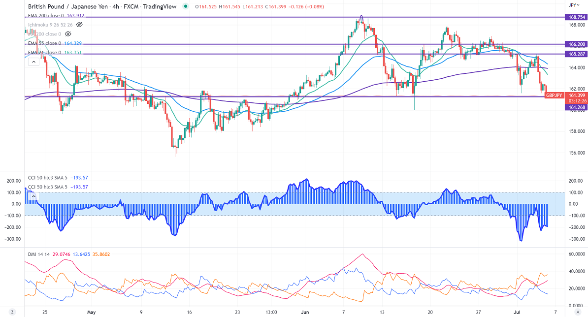 GBPJPY declined sharply and lost more than 350 pips from yesterday's high of 165.21. The pound sterling tanks below the 1.2000 level on board-based US dollar buying and BOE pessimistic report on UK economic outlook. Any daily close below 1.19000 confirms a bearish continuation. Technically in the 4-hour chart, the pair is holding below 21-EMA, above 55 EMA, and long-term 200 EMA (163.93). Any break below 160 will drag the pair down to 158.25/157.15. GBPJPY hits an intraday low of 161.28 and is currently trading around 161.35.