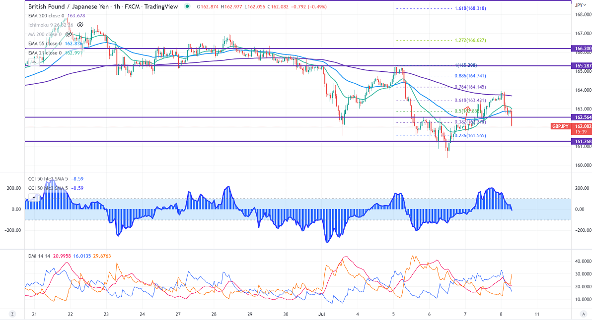 GBPJPY lost its shine after a minor pullback to 163.92. The pound sterling pared some of its gains made after UK PM Boris Johnson Quits as Tory leader. Markets eye US Non-farm payroll and UK political development for further direction. Any daily close below 1.19000 confirms a bearish continuation. Technically in the 1-hour chart, the pair is holding below short-term 21-EMA, 55 EMA, and long-term 200 EMA (162.85). Any hourly close below 162.80 will drag the pair down to 162/161.50/160. GBPJPY hits an intraday low of 162.15 and is currently trading around 162.148.