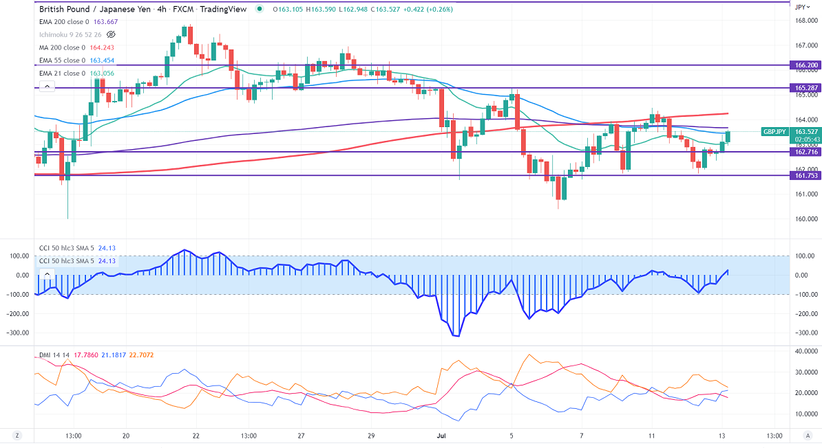 GBPJPY trading in a narrow range between 164.46 and 161.82 for the past three days. The pound sterling recovered to a softer US dollar. Markets eye BOE Bailey's speech confirms that the central bank's main focus is to keep inflation back to 2%. Any violation below 1.1800 confirms a bearish continuation. Technically in the 4-hour chart, GBPJPY the pair is holding above short-term 21-EMA, below 55 EMA, and long-term 200 EMA (163.66). Any breach above 163.50 will take the pair to next level to 164/164.50/166. GBPJPY hits an intraday high of 163.50 and is currently trading around 163.075.