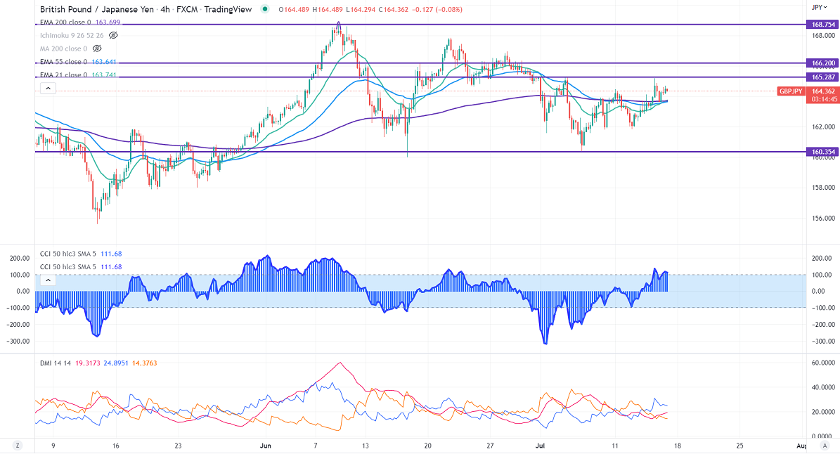 Technically in the 4-hour chart, GBPJPY the pair is holding above short-term 21-EMA, 55 EMA, and long-term 200 EMA (163.69). Any breach above 165.20 will take the pair to next level to 166/167. GBPJPY hits an intraday high of 164.70 and is currently trading around 164.35.