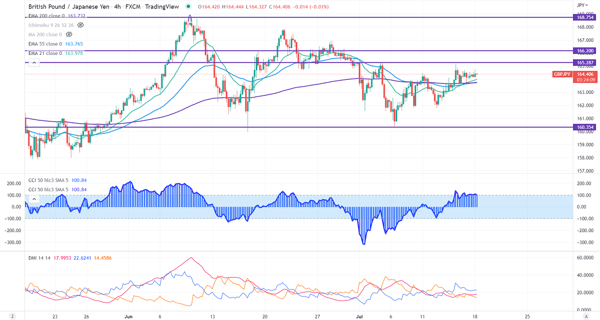 GBPJPY trades in a narrow range between 165.19 and 163.56 for the past two days. The pound sterling gained above 1.18500 as the probability of a 100 bpbs hike by the Fed in the June meeting fades. Any jump above 1.9100 confirms a bearish continuation. Technically in the 4-hour chart, the pair is holding above short-term 21-EMA, 55 EMA, and long-term 200 EMA (163.72). Any breach above 165.20 will take the pair to next level to 166/167. GBPJPY hits an intraday high of 165.19 and is currently trading around 164.418.