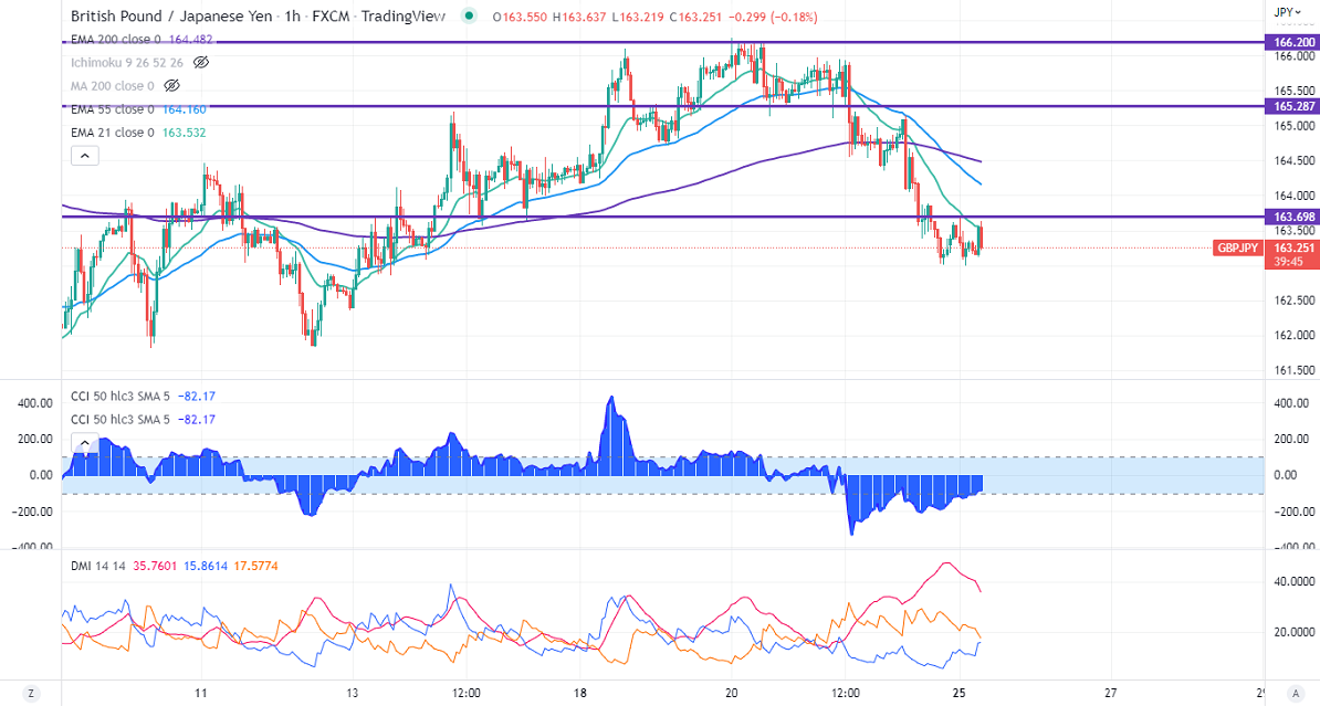 GBPJPY has formed double bottom around 163 and showed a nice pullback. The pair was the worst performer the previous week and lost 300 pips on a strong yen. The recovery in Pound sterling on board-based US dollar selling prevented the GBPJPY from further sell-off. Any break above 1.2050 confirms further bullishness. Technically in the 4-hour chart, the pair is holding below short-term 21-EMA, 55 EMA, and above long-term 200 EMA (164.05). Any breach below 164.48 will drag the pair to the next level to 163.80/163/161.80/160. GBPJPY hits an intraday high of 164.82 and is currently trading around 164.78.