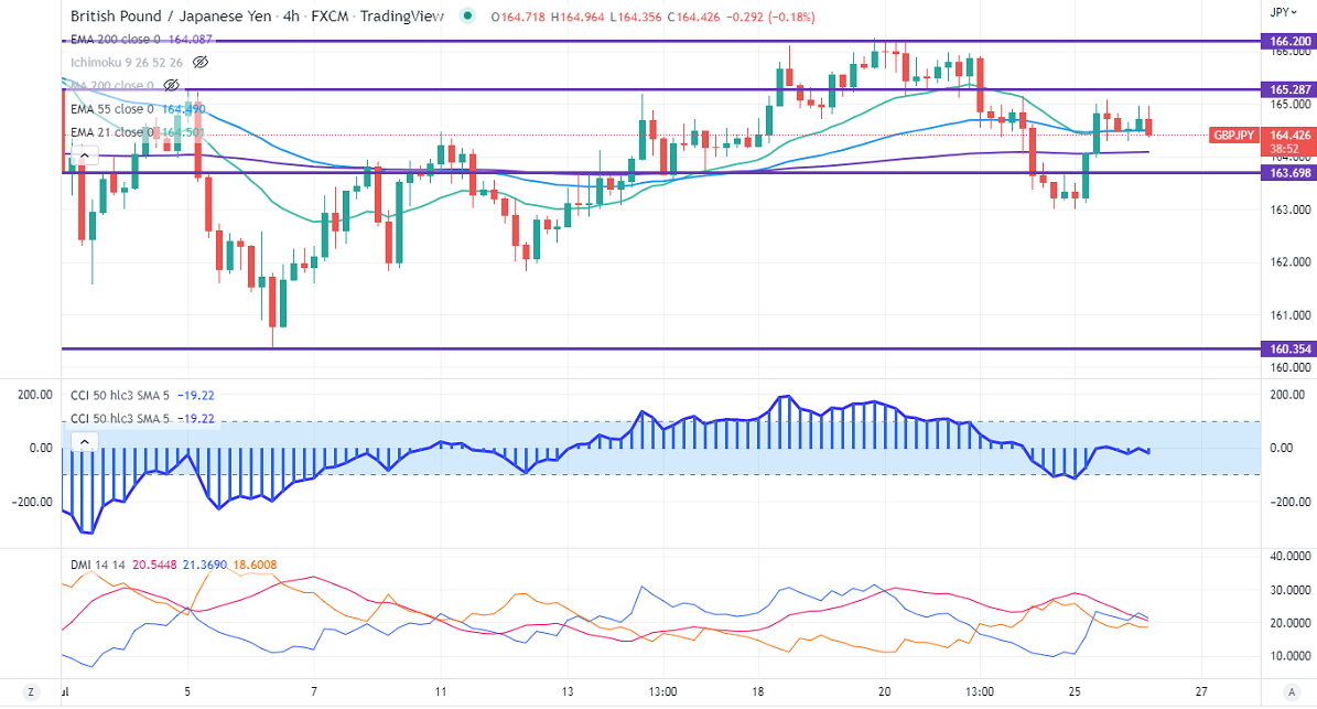 GBPJPY showed a minor weakness after hitting a high of 165.08 on a weak Pound. It has pared some of its gains from a two-week high of 1.2090. The upbeat UK PMI has increased the chance of a 50 bpbs rate hike by the Bank of England. Any break above 1.2100 confirms further bullishness. Technically in the 4-hour chart, the pair is holding above short-term 21-EMA, 55 EMA, and above long-term 200 EMA (164.05). Any breach below 164 will drag the pair down to take it to the next level to 163/161.80/160. GBPJPY hits an intraday high of 164.96 and is currently trading around 164.59.