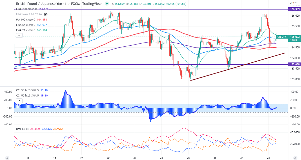 GBPJPY pared most of its gains made yesterday after the Fed monetary policy. A dovish rate hike by Fed has dragged the US dollar down against Yen. The nice pullback in pound sterling prevents the pair from further sell-off. Any break above 1.2200 confirms further bullishness. Technically in the 4-hour chart, the pair is holding below short-term 21-EMA, above 55 EMA, and long-term 200 EMA (164.17). Any breach above165.25 will take the pair to next level to 166.35/167. GBPJPY hits an intraday low of 164.52 and is currently trading around 165.10.