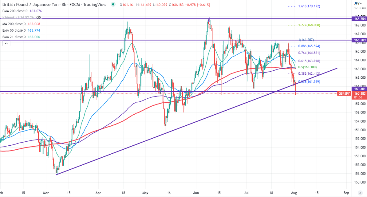 GBPJPY lost its shine and lost more than 200 pips yesterday on a strong yen. The yen was one of the best performers against all majors on risk- aversion and board-based US dollar selling. The minor profit booking in the Pound sterling also puts pressure on the pair at higher levels. Any break above 1.2300 confirms further bullishness. Technically in the 8-hour chart, the pair is holding below short-term 21-EMA, above 55 EMA, and long-term 200 EMA (163.105). Any breach below 160 will take the pair to next level to 157/155.60. GBPJPY hits an intraday low of 160.02 and is currently trading around 160.19.
