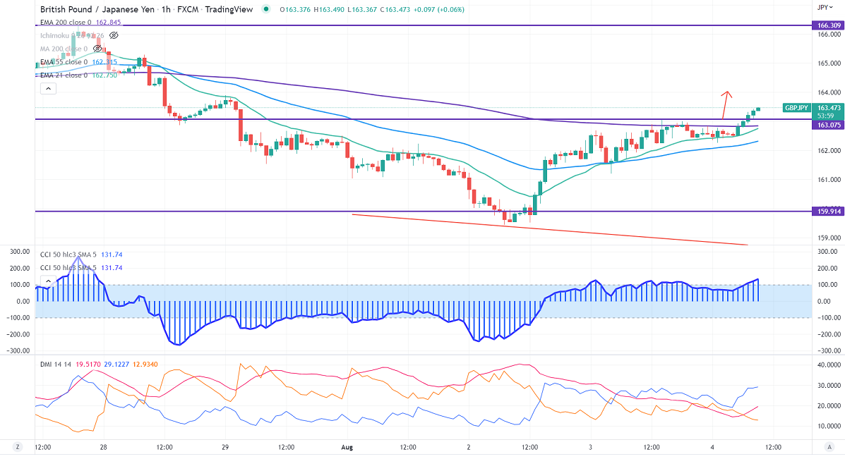 GBPJPY is trading flat ahead of Bank of England monetary policy. Markets expect BOE to hike rates by 50 bpbs highest levels since 1995 as UK CPI hits a 40-year high. The minor weakness in the yen also supports the pair at lower levels. Technically in the hourly chart, the pair is holding above short-term 21-EMA, above 55 EMA, and long-term 200 EMA (162.87). Any violation above 163..67 will take to the next level to 164.30/165. GBPJPY hits an intraday high of 163.05 and is currently trading around 162.18.